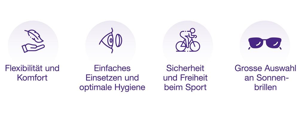 Kontaktlinsen bieten viele Vorteile. Es gibt sie für alle Arten von Korrekturen, egal ob Sie kurzsichtig, weitsichtig oder alterssichtig sind, oder eine Hornhautverkrümmung haben. Ob als Tages-, Zweiwochen- oder Monatslinsen: Die Einstärken- oder Gleitsichtlinsen der neusten Generation entsprechen dem neusten Stand der Materialtechnologie und bieten Ihnen daher einen hohen Tragekomfort sowie eine optimale Feuchtigkeitsversorgung den ganzen Tag über. Ihre Optikerin oder Ihr Optiker berät Sie gerne zu den für Sie am besten geeigneten Kontaktlinsen, damit Sie sich voll und ganz auf Ihre Aktivitäten konzentrieren können!