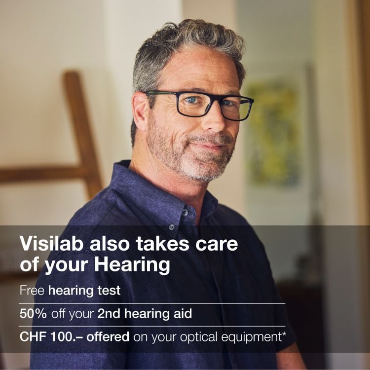 Visilab is also offering you a 50% discount on your 2nd hearing aid* and CHF 100.- offered on your optical equipment, with the purchase of hearing aids**. This offer can be combined with current promotions.